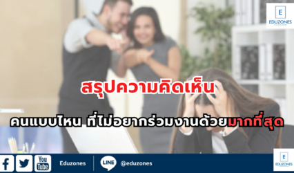 Blogนักศึกษานักเรียน สรุปความคิดเห็น “คนแบบไหน ที่ไม่อยากร่วมงานมากที่สุด” EZ Webmaster July 15, 2024 แน่นอนว่าสังคมการทำงานย่อมต้องพบเจอกับบุคคลหลากหลายและแตกต่างกันไป และมักจะมีคนประเภทที่เราไม่อยากร่วมงานด้วยที่สุด วันนี้จะมารวมความคิดเห็นจากชาวชุมชน Eduzones ที่ได้ร่วมแสดงความคิดเห็นว่า “คนแบบไหนที่ไม่อยากร่วมงานมากที่สุด” ดูความคิดเห็นได้ที่นี่ โดยทาง Eduzones ได้สรุปความคิดเห็นจากชาวชุมชน Eduzones ออกเป็น 4 ประเด็นหลัก ดังนี้…