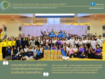 tui sakrapee March 3, 2025 อบรมเสริมสร้างความรู้เกี่ยวกับการเลือกตั้งองค์กรปกครองส่วนท้องถิ่นในสถานศึกษา tui sakrapee March 3, 2025 วันที่ 3 มีนาคม 2568 – นักศึกษาหลักสูตรการพัฒนาผู้นำทางการเมืองในระบอบประชาธิปไตย รุ่นที่ 1 ของสำนักงานคณะกรรมการการเลือกตั้ง (กกต.) ได้เข้าร่วมการอบรมเสริมสร้างความรู้เกี่ยวกับการเลือกตั้งองค์กรปกครองส่วนท้องถิ่น ณ มหาวิทยาลัยราชภัฏสวนสุนันทา โครงการดังกล่าวจัดขึ้นโดยคณะผู้จัดทำโครงงาน พนต.1 กลุ่ม 2 เพื่อเสริมสร้างความรู้และความเข้าใจแก่ประชาชนเกี่ยวกับกระบวนการเลือกตั้งนายกเทศมนตรีและสมาชิกสภาเทศบาล โดยมุ่งหวังให้เกิดการพัฒนาความเป็นพลเมืองที่มีคุณภาพในระบอบประชาธิปไตย อันมีพระมหากษัตริย์ทรงเป็นประมุข ภายใต้โครงการนี้ มีกิจกรรมให้ความรู้แก่ประชาชนผ่านการจัดกิจกรรมเชิงสร้างสรรค์ การเผยแพร่สื่อประชาสัมพันธ์ และการถ่ายทอดองค์ความรู้ด้านการปกครองในระบอบประชาธิปไตย โดยเนื้อหาครอบคลุมประเด็นสำคัญ ได้แก่ • บทบาทและความสำคัญของการเป็นพลเมืองคุณภาพ • การมีส่วนร่วมทางการเมืองของประชาชน • การสร้างภูมิคุ้มกันทางความคิดเกี่ยวกับระบอบประชาธิปไตย… Continue Reading