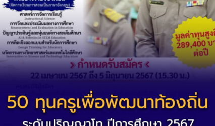 ครู-อาจารย์ 50 ทุนครูเพื่อพัฒนาท้องถิ่นระดับปริญญาโท ปีการศึกษา 2567 สถาบันนวัตกรรมการเรียนรู้ ม.มหิดล EZ Webmaster June 4, 2024 ทุนครูเพื่อพัฒนาท้องถิ่นระดับปริญญาโท ปีการศึกษา 2567 จำนวน 50 ทุน! (ทุนในประเทศ) หลักสูตรวิทยาศาสตรมหาบัณฑิต สาขาวิชาวิทยาศาสตร์และเทคโนโลยีศึกษา (หลักสูตรนานาชาติ) สถาบันนวัตกรรมการเรียนรู้ เข้าร่วมเป็นหนึ่งในสถาบันผลิตของโครงการผลิตครูเพื่อพัฒนาท้องถิ่น ระดับปริญญาโททางการสอน รุ่นบรรจุปี พ.ศ.2563 จำนวน…