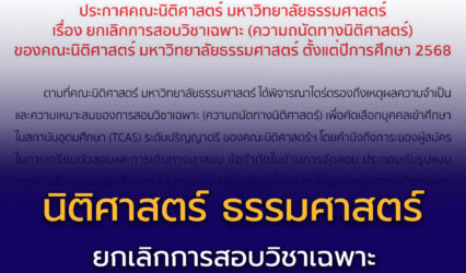 ข่าวเด่นนักเรียน คณะนิติศาสตร์ มหาวิทยาลัยธรรมศาสตร์ ยกเลิกการสอบวิชาเฉพาะ (ความถนัดทางนิติศาสตร์) EZ Webmaster May 24, 2024 ประกาศคณะนิติศาสตร์ มหาวิทยาลัยธรรมศาสตร์เรื่อง ยกเลิกการสอบวิชาเฉพาะ (ความถนัดทางนิติศาสตร์)ของคณะนิติศาสตร์ มหาวิทยาลัยธรรมศาสตร์ ตั้งแต่ปีการศึกษา 2568.ตามที่คณะนิติศาสตร์ มหาวิทยาลัยธรรมศาสตร์ ได้พิจารณาไตร่ตรองถึงเหตุผลความจำเป็นและความเหมาะสมของการสอบวิชาเฉพาะ (ความถนัดทางนิติศาสตร์) เพื่อคัดเลือกบุคคลเข้าศึกษาในสถาบันอุดมศึกษา (TCAS) ระดับปริญญาตรี ของคณะนิติศาสตร์ฯ โดยคำนึงถึงภาระของผู้สมัครในการเตรียมตัวสอบและการเดินทางมาสอบ ข้อจำกัดในด้านการจัดสอบ…