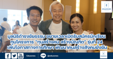 โอกาสเปลี่ยนชีวิต! “ซีพี ออลล์” สนับสนุนทุนเรียนฟรี พร้อมรายได้ระหว่างเรียน ผ่านสถาบันการศึกษาในเครือข่ายปัญญาภิวัฒน์ สร้างคนรุ่นใหม่สู่โลกงานจริงอย่างมั่นใจ EZ WebmasterApril 7, 2026 โอกาสเปลี่ยนชีวิต! “ซีพี ออลล์” สนับสนุนทุนเรียนฟรี พร้อมรายได้ระหว่างเรียน ผ่านสถาบันการศึกษาในเครือข่ายปัญญาภิวัฒน์ สร้างคนรุ่นใหม่สู่โลกงานจริงอย่างมั่นใจ “เรียนฟรี มีรายได้ จบแล้วมีงานทำ” ไม่ใช่แค่คำโฆษณา แต่คือโอกาสจริงที่ “ซีพี ออลล์” ตั้งใจมอบให้กับคนรุ่นใหม่ทั่วประเทศ บริษัท ซีพี ออลล์… เปิดประตูสู่องค์กรระดับโลก! GCNT เปิดรับสมัคร Programme Intern 2026 สาย ESG–กฎหมาย–สังคม ร่วมขับเคลื่อน SDGs ในไทย EZ WebmasterApril 6, 2026 เปิดประตูสู่องค์กรระดับโลก! GCNT เปิดรับสมัคร Programme Intern 2026 สาย ESG–กฎหมาย–สังคม ร่วมขับเคลื่อน SDGs ในไทย โดย กองบรรณาธิการ Eduzones | อัปเดต 2569 โอกาสสำคัญสำหรับนักศึกษาและบัณฑิตจบใหม่ที่ใฝ่ฝันอยากทำงานในองค์กรระดับนานาชาติ… ทุนเรียนต่อออสเตรเลียเต็มจำนวน! Deakin University เปิดรับสมัคร RTP Scholarships ระดับโท (วิจัย) – เอก ปี 2027 EZ WebmasterApril 5, 2026 ทุนเรียนต่อออสเตรเลียเต็มจำนวน! Deakin University เปิดรับสมัคร RTP Scholarships ระดับโท (วิจัย) – เอก ปี 2027 โดย กองบรรณาธิการ Eduzones | อัปเดต 2569… เปิดรับ “ทุนรัฐบาล กระทรวงการต่างประเทศ 2569” เรียนต่อปริญญาโทต่างประเทศ สายรัฐศาสตร์–เศรษฐศาสตร์–กฎหมาย EZ WebmasterApril 3, 2026 🎓 เปิดรับ “ทุนรัฐบาล กระทรวงการต่างประเทศ 2569” เรียนต่อปริญญาโทต่างประเทศ สายรัฐศาสตร์–เศรษฐศาสตร์–กฎหมาย โดย กองบรรณาธิการ Eduzones (อัปเดต 2569) อีกหนึ่งทุนระดับประเทศที่น่าสนใจสำหรับคนที่อยากเรียนต่อ “ต่างประเทศ” และทำงานด้านนโยบายหรือความสัมพันธ์ระหว่างประเทศ ล่าสุด กระทรวงการต่างประเทศ เปิดรับสมัคร… ครู-อาจารย์ สสวท. เดินหน้าพัฒนาครู ตชด. ภาคอีสาน ผ่าน “โครงงานปฐมวัย” ปั้นเด็กคิดเป็น เรียนรู้จากการลงมือทำ EZ WebmasterApril 8, 2026 สถาบันส่งเสริมการสอนวิทยาศาสตร์และเทคโนโลยี (สสวท.) จัดอบรมเชิงปฏิบัติการหลักสูตร “การจัดการเรียนรู้แบบโครงงานสำหรับเด็กปฐมวัย” สำหรับครูและบุคลากรระดับปฐมวัยสังกัดโรงเรียนตำรวจตระเวนชายแดน ครั้งที่ 2 ภาคตะวันออกเฉียงเหนือ ระหว่างวันที่ 7–9 เมษายน 2569 ณ โรงแรมเลอ แคสเซีย จ.ขอนแก่น โดยมี ดร.พจนา ดอกตาลยงค์… สสวท. จัดอบรมขยายผลหลักสูตรการจัดการเรียนรู้วิชาวิทยาศาสตร์และคณิตศาสตร์ ระดับมัธยมศึกษา ณ ศูนย์เครือข่ายวิชาการครู สควค. ภาคตะวันออกเฉียงเหนือ EZ WebmasterApril 8, 2026 สถาบันส่งเสริมการสอนวิทยาศาสตร์และเทคโนโลยี (สสวท.) เดินหน้าพัฒนาศักยภาพครูไทยอย่างต่อเนื่อง ด้วยการนำร่องเปิดอบรมเชิงปฏิบัติการขยายผลหลักสูตรก