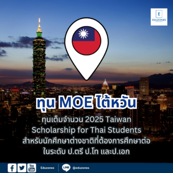 EZ Webmaster February 10, 2025 ทุน 2025 Taiwan Scholarship for Thai Students ที่ไต้หวัน EZ Webmaster February 10, 2025 ทุน 2025 Taiwan Scholarship for Thai Students ที่ไต้หวัน Ministry of Education Scholarship (MOE) จากรัฐบาลไต้หวัน ให้ทุน 2025 Taiwan Scholarship for Thai Students ทุนเต็มจำนวน 20 คน สำหรับการสนับสนุนนักศึกษาต่างชาติที่ต้องการศึกษาต่อในระดับปริญญาตรี ปริญญาโท และปริญญาเอก ที่มหาวิทยาลัยชั้นนำของไต้หวัน ทุนการศึกษาเต็มจำนวน ครอบคลุมทั้งค่าเทอมและค่าครองชีพ สมัครได้ตั้งแต่วันนี้… Continue Reading