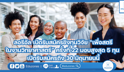 ครู-อาจารย์นักศึกษา ลอรีอัล เปิดรับสมัครชิงทุนวิจัย “เพื่อสตรีในงานวิทยาศาสตร์” ครั้งที่ 22 มอบสูงสุด 5 ทุน เปิดรับสมัครถึง 30 มิถุนายนนี้ EZ Webmaster May 14, 2024 โครงการทุนวิจัย ลอรีอัล ประเทศไทย เพื่อสตรีในงานวิทยาศาสตร์ สานต่อความสำเร็จปีที่ 22 เปิดรับสมัครนักวิจัยสตรีไทย อายุไม่เกิน 40 ปี ผู้เป็นเจ้าของงานวิจัยอิสระในสาขาวิทยาศาสตร์กายภาพ หรือวิทยาศาสตร์ชีวภาพ ที่ยังอยู่ในระหว่างการดำเนินการ เดินหน้ามอบทุนสูงสุดจำนวน 5 ทุน ทุนละ 250,000 บาท และโล่เกียรติคุณ พร้อมจัดงาน Conversations with the Fellows ไปเมื่อเร็ว ๆ นี้…
