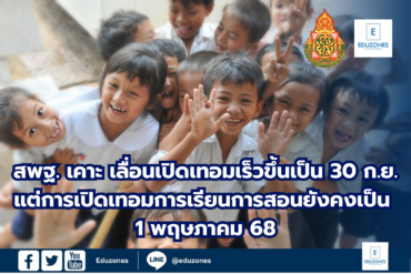 สพฐ. เคาะ เลื่อนเปิดเทอมเร็วขึ้นเป็น 30 ก.ย. แต่การเปิดเทอมการเรียนการสอนเป็น 1 พฤษภาคม 68 EZ Webmaster February 4, 2025 สพฐ. ได้ข้อสรุปเลื่อนปิดเทอม 1 เป็นวันที่ 30 ก.ย. สอดคล้องปีงบประมาณ บุคลากร การบริหารจัดการงบอาหารกลางวัน การจัดซื้อจัดจ้าง ชง ‘บิ๊กอุ้ม’ไฟเขียว เมื่อวันที่ 3 ก.พ.2568 ว่าที่ร้อยตรี ธนุ วงษ์จินดา เลขาธิการคณะกรรมการการศึกษาขั้นพื้นฐาน (กพฐ.) เปิดเผยว่า ตนได้เชิญหน่วยงานที่มีสถานศึกษาในสังกัด ทั้งกรมส่งเสริมการเรียนรู้ (สกร.) สำนักงานคณะกรรมการการอาชีวศึกษา (สอศ.) สำนักงานคณะกรรมการส่งเสริมการศึกษาเอกชน (สช.) กรมการปกครองส่วนท้องถิ่น (อปท.) ผู้แทนจากกระทรวงการอุดมศึกษาวิทยาศาสตร์ วิจัย และนวัตกรรม มาหารือการเลื่อนเปิด-ปิด ภาคเรียนที่ 1 ให้ตรงกับปีงบประมาณ ซึ่งทุกฝ่าย เห็นด้วยกับแนวทางดังกล่าว โดยมีมติให้ปรับวันเปิดภาคเรียนที่ 1 โดยยังคงให้เปิดเรียนวันที่… Continue Reading