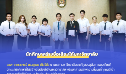 Blogนักศึกษา สภามหาวิทยาลัยมอบเกียรติบัตรชื่นชมนักศึกษาสวนสุนันทา ที่สร้างชื่อเสียงให้มหาวิทยาลัย tui sakrapee May 1, 2024 นักศึกษา สวนสุนันทา เข้ารับการแสดงความชื่นชมและเกียรติบัตรจากสภามหาวิทยาลัย หลังจากที่ได้สร้างชื่อเสียงให้กับมหาวิทยาลัย เมื่อวันที่ 24 เมษายน 2567 รองศาสตราจารย์ ดร.ฤๅเดช เกิดวิชัย นายกสภามหาวิทยาลัยราชภัฏสวนสุนันทา มอบเกียรติบัตรแก่นักศึกษาที่ได้สร้างชื่อเสียงให้กับมหาวิทยาลัย พร้อมกล่าวแสดงความชื่นชมที่ทุกคนได้นำวิชาความรู้ไปใช้ให้เกิดประโยชน์จนส่งผลดีต่อตนเอง รายชื่อนักศึกษาที่ได้รับรางวัล 1.…