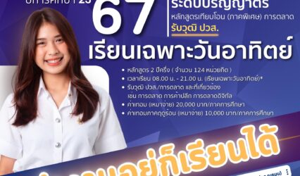 Blogนักเรียน คณะบริหารธุรกิจ มทร.ธัญบุรี เปิดรับสาขาการตลาด หลักสูตรเทียบโอน (ภาคพิเศษ) เรียนเฉพาะวันอาทิตย์ tui sakrapee May 1, 2024 คณะบริหารธุรกิจ มหาวิทยาลัยเทคโนโลยีราชมงคลธัญบุรี เปิดรับสมัครนักศึกษา สาขาการตลาด หลักสูตรเทียบโอน (ภาคพิเศษ) ประจำปีการศึกษา 2567 หลักสูตร 2 ปีครึ่ง ( จำนวน 124 หน่วยกิต )…