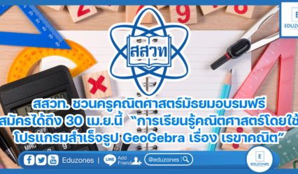 ครู-อาจารย์ สสวท. ชวนครูคณิตศาสตร์มัธยมอบรมฟรี สมัครได้ถึง 30 เม.ย.นี้ “การเรียนรู้คณิตศาสตร์โดยใช้โปรแกรมสําเร็จรูป GeoGebra เรื่อง เรขาคณิต” EZ Webmaster April 29, 2024 สถาบันส่งเสริมการสอนวิทยาศาสตร์และเทคโนโลยี (สสวท.) เชิญครูผู้สอนคณิตศาสตร์ระดับมัธยมศึกษาและผู้สนใจ อบรมหัวข้อ “การเรียนรู้คณิตศาสตร์โดยใช้โปรแกรมสําเร็จรูป GeoGebra เรื่อง เรขาคณิต” ในรูปแบบออนไลน์ สมัครได้ตั้งแต่บัดนี้ถึง 30 เมษายน 2567 อบรมระหว่างวันที่ 1 พฤษภาคม – 31 กรกฎาคม…