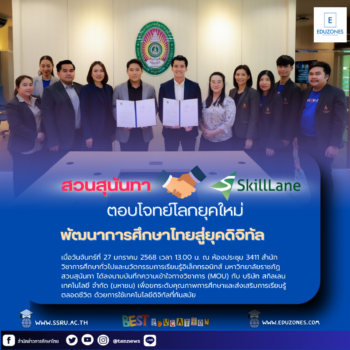 มหาวิทยาลัยราชภัฏสวนสุนันทา จับมือ SkillLane ตอบโจทย์โลกยุคใหม่ พัฒนาการศึกษาไทยสู่ยุคดิจิทัล tui sakrapee January 27, 2025 เมื่อวันจันทร์ที่ 27 มกราคม 2568 เวลา 13.00 น. ณ ห้องประชุม 3411 สำนักวิชาการศึกษาทั่วไปและนวัตกรรมการเรียนรู้อิเล็กทรอนิกส์ มหาวิทยาลัยราชภัฏสวนสุนันทา ได้ลงนามบันทึกความเข้าใจทางวิชาการ (MOU) กับ บริษัท สกิลเลน เทคโนโลยี จำกัด (มหาชน) เพื่อยกระดับคุณภาพการศึกษาและส่งเสริมการเรียนรู้ตลอดชีวิต ด้วยการใช้เทคโนโลยีดิจิทัลที่ทันสมัย พิธีลงนามได้รับเกียรติจาก รศ.ดร.ชุติกาญจน์ ศรีวิบูลย์ อธิการบดีมหาวิทยาลัยราชภัฏสวนสุนันทา โดยมอบหมายให้ ผศ.ดร.ณัฐภัทร แก้วรัตนภัทร์ รองอธิการบดีฝ่ายวิชาการ เป็นผู้กล่าวต้อนรับ และมี ดร.มาธุสร แข็งขัน ผู้อำนวยการสำนักวิชาการศึกษาทั่วไปและนวัตกรรมการเรียนรู้อิเล็กทรอนิกส์ พร้อมด้วยผู้บริหารระดับสูงของมหาวิทยาลัยร่วมในงาน ทางด้าน คุณเอกฉัตร อัศวรุจิกุล กรรมการผู้จัดการ บริษัท สกิลเลน… Continue Reading