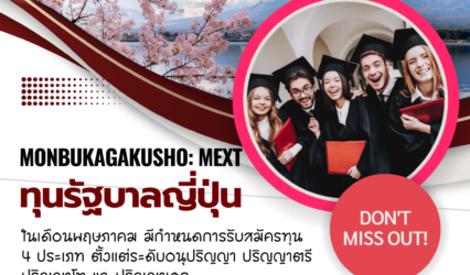 Blogทุนดีดี เตรียมให้พร้อม! ทุนรัฐบาลญี่ปุ่น (Monbukagakusho: MEXT) เปิดรับ พ.ค.นี้ ใน 4 ประเภท ตั้งแต่อนุปริญญาจนถึงระดับดอกเตอร์ tui sakrapee April 1, 2024 สถานเอกอัครราชทูตญี่ปุ่นประจำประเทศไทย เปิดรับสมัครและคัดเลือกผู้สมัครชาวไทยเป็นประจำทุกปี เพื่อรับทุนการศึกษาของรัฐบาลญี่ปุ่นไปศึกษาที่สถาบันการศึกษาญี่ปุ่น โดยมีทุนทั้งหมด 7 ประเภท ในเดือนพฤษภาคม มีกำหนดการรับสมัครทุน 4 ประเภท ตั้งแต่ระดับอนุปริญญา ปริญญาตรี ปริญญาโท และปริญญาเอก ผู้ที่สนใจสามารถศึกษาข้อมูลเพื่อเตรียมความพร้อมได้ตามข้อมูลจากสถานเอกอัครราชทูตญี่ปุ่นประจำประเทศไทย 1.ทุนนักศึกษาปริญญาตรี…