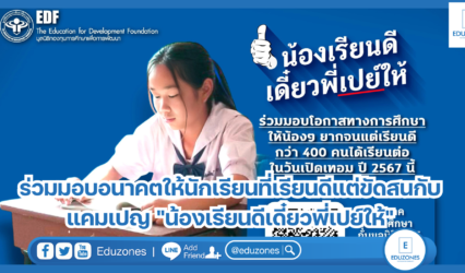 นักเรียน ร่วมมอบอนาคตให้นักเรียนที่เรียนดีแต่ขัดสนกับแคมเปญ “น้องเรียนดีเดี๋ยวพี่เปย์ให้” EZ Webmaster March 28, 2024 เพื่อส่งเสริมให้นักเรียนระดับชั้นมัธยมศึกษาตอนต้นที่เรียนดีที่มีเกรดเฉลี่ยสะสม 3.00 ขึ้นไป แต่ครอบครัวมีฐานะยากจนให้สามารถเรียนต่อจนจบช่วงชั้นเรียนเพื่อลดความเสี่ยงจากการหลุดออกจากระบบการศึกษากลางคัน และยังช่วยสร้างเสริมกำลังใจในการเรียนอย่างเต็มศักยภาพโดยไม่ต้องกังวลเกี่ยวกับฐานะความเป็นอยู่ของตนเอง มูลนิธิ EDF (มูลนิธิกองทุนการศึกษาเพื่อการพัฒนา) เชิญผู้ใหญ่ใจดีร่วมส่งเสริมการศึกษามอบทุนให้นักเรียนชั้นมัธยมศึกษาตอนต้นที่เรียนดีแต่ยากจนสำหรับปีการศึกษา 2567 ทุนละ 3,000 บาทต่อคนต่อปี ได้ภายใน 30 มิถุนายน…