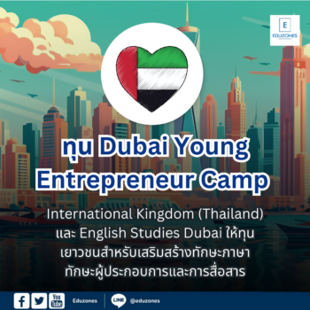 ทุน Dubai Young Entrepreneur Camp ที่ดูไบ ประเทศสหรัฐอาหรับเอมิเรตส์ EZ Webmaster January 7, 2025 DUBAI YOUNG ENTREPRENEUR CAMP 2025 ทุนจำนวน 15 คน สำหรับเยาวชนชาวไทย อายุระหว่าง 14 – 25 ปี ที่ต้องการเสริมสร้างทักษะผู้ประกอบการและการสื่อสาร พร้อมสัมผัสประสบการณ์อันล้ำค่า ร่วมก้าวสู่การเป็นผู้นำและผู้ประกอบการแห่งอนาคต ณ มหานครดูไบ ประเทศสหรัฐอาหรับเอมิเรตส์ โดย International Kingdom (Thailand) และ English Studies Dubai ระยะเวลาดำเนินการทั้งหมด 3 เดือน ตั้งแต่เดือนกุมภาพันธ์ 2568 ถึงเดือนเมษายน 2568 . DUBAI YOUNG ENTREPRENEUR CAMP 2025 Shape… Continue Reading