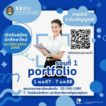 tui sakrapee January 6, 2025 ยังทันวันสุดท้าย !! รอบที่ 1 Portfolio “สวนสุนันทา” เปิดรับ 5,112 ที่นั่ง ถึง 7 ม.ค.นี้ tui sakrapee January 6, 2025 มหาวิทยาลัยราชภัฏสวนสุนันทา มีความประสงค์จะเปิดรับสมัครบุคคลเข้าศึกษาในมหาวิทยาลัยราชภัฏสวนสุนันทาภาคปกติ ระดับปริญญาตรี ประจำปีการศึกษา 2568 (รอบที่ 1 Portfolio) ตั้งแต่วันนี้ – 7 ม.ค. 2568 สมัครได้ที่: https://admission.ssru.ac.th/loginสอบถามข้อมูลเพิ่มเติม: รับสมัครนักศึกษา มหาวิทยาลัยราชภัฏสวนสุนันทา หรือโทร 02-160-1380 ระหว่างวันที่1 พฤศจิกายน 2567 – 7 มกราคม 2568 รายละเอียดเกี่ยวกับการรับสมัครสอบคัดเลือก สมัครที่ https://admission.ssru.ac.th/login **สอบถามเพิ่มเติมที่ รับสมัครนักศึกษา มหาวิทยาลัยราชภัฏสวนสุนันทา หรือโทร 02-160-1380 Continue Reading