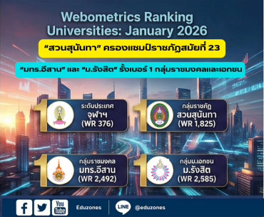 จุฬาฯ ยืนหนึ่งผลการจัดอันดับ Webometrics มกราคม 2569 “สวนสุนันทา” ครองแชมป์ราชภัฏสมัยที่ 23 ด้าน “มทร.อีสาน” และ “ม.รังสิต” รั้งเบอร์ 1 กลุ่มราชมงคลและเอกชนอย่างเหนียวแน่น tui sakrapee January 26, 2026 จุฬาฯ ยืนหนึ่งผลการจัดอันดับ Webometrics มกราคม 2569 — “สวนสุนันทา” ครองแชมป์ราชภัฏสมัยที่ 23 ด้าน “มทร.อีสาน” และ “ม.รังสิต” รั้งเบอร์ 1 กลุ่มราชมงคลและเอกชนอย่างเหนียวแน่น ประกาศผลอย่างเป็นทางการแล้วสำหรับการจัดอันดับมหาวิทยาลัยโลก Webometrics Ranking of World Universities ประจำเดือนมกราคม 2569 ซึ่งจัดทำโดย Cybermetrics Lab ประเทศสเปน ผลปรากฏว่า จุฬาลงกรณ์มหาวิทยาลัย ยังคงรักษาตำแหน่งมหาวิทยาลัยอันดับ 1 ของประเทศไทยไว้ได้อย่างสง่างาม โดยขยับขึ้นมาอยู่อันดับที่ 376 ของโลก สะท้อนถึงความเป็นเลิศในการเผยแพร่ข้อมูลวิชาการและการเป็นมหาวิทยาลัยดิจิทัลระดับสากล ในกลุ่มมหาวิทยาลัยราชภัฏ มหาวิทยาลัยราชภัฏสวนสุนันทา สร้างประวัติศาสตร์หน้าใหม่ด้วยการครองอันดับ 1 ในกลุ่มต่อเนื่องเป็นสมัยที่… Continue Reading