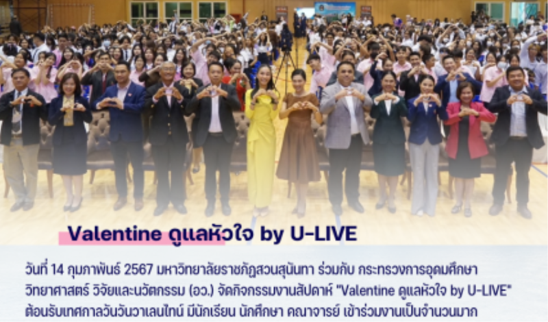 นักศึกษา สวนสุนันทาร่วมจัดงานสัปดาห์ “Valentine ดูแลหัวใจ by U-LIVE” กับ กระทรวง อว. tui sakrapee February 15, 2024 วันที่ 14 กุมภาพันธ์ 2567 มหาวิทยาลัยราชภัฏสวนสุนันทา ร่วมกับ กระทรวงการอุดมศึกษา วิทยาศาสตร์ วิจัยและนวัตกรรม (อว.) จัดกิจกรรมงานสัปดาห์ “Valentine ดูแลหัวใจ by U-LIVE” ต้อนรับเทศกาลวันวันวาเลนไทน์…