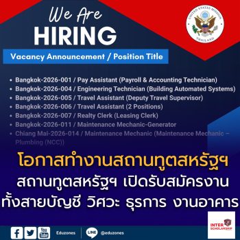 EZ Webmaster January 25, 2026 สถานทูตสหรัฐอเมริกาในประเทศไทย เปิดรับสมัครงานหลายตำแหน่ง ปี 2026 โอกาสทำงานองค์กรระดับโลก EZ Webmaster January 25, 2026 สถานทูตสหรัฐอเมริกาในประเทศไทย เปิดรับสมัครงานหลายตำแหน่ง ปี 2026 โอกาสทำงานองค์กรระดับโลก สถานทูตสหรัฐอเมริกาในประเทศไทยประกาศเปิดรับสมัครบุคลากรเข้าทำงาน หลายตำแหน่งประจำปี 2026 เปิดโอกาสให้ผู้ที่สนใจงานสายอินเตอร์ได้ร่วมทำงานกับองค์กรระดับนานาชาติพร้อมสั่งสมประสบการณ์ในสภาพแวดล้อมการทำงานระดับโลก การเปิดรับสมัครครั้งนี้ครอบคลุมทั้งพื้นที่ กรุงเทพมหานคร และ จังหวัดเชียงใหม่เหมาะสำหรับผู้ที่มีทักษะด้านธุรการ การเงิน วิศวกรรม งานอาคาร และงานสนับสนุนการเดินทาง ตำแหน่งงานที่เปิดรับสมัคร (อัปเดตปี 2026) ตำแหน่งที่เปิดรับในรอบนี้ ได้แก่ Pay Assistant(Payroll & Accounting Technician) Engineering Technician(Building Automated Systems) Travel… Continue Reading