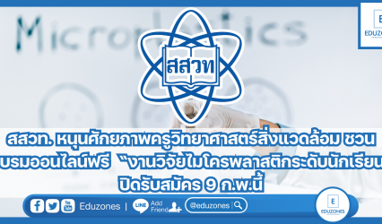 นักเรียน สสวท. หนุนศักยภาพครูวิทยาศาสตร์สิ่งแวดล้อม ชวนอบรมออนไลน์ฟรี “งานวิจัยไมโครพลาสติกระดับนักเรียน” ปิดรับสมัคร 9 ก.พ.นี้ EZ Webmaster February 6, 2024 สถาบันส่งเสริมการสอนวิทยาศาสตร์และเทคโนโลยี (สสวท.) เชิญคุณครูและบุคลากรการศึกษาอบรมหลักสูตรส่งเสริมศักยภาพการทำงานวิจัยในรูปแบบออนไลน์ หัวข้อ “งานวิจัยไมโครพลาสติกระดับนักเรียน” เพื่อส่งเสริมศักยภาพการทำงานวิจัยวิทยาศาสตร์สิ่งแวดล้อม โดยวิทยากร ดร.นันทิดา สุธรรมวงศ์ มหาวิทยาลัยเกษตร ศาสตร์ วันศุกร์ที่ 16 กุมภาพันธ์ 2567 เวลา 08.30 – 12.00 น. ปิดรับสมัครวันที่…