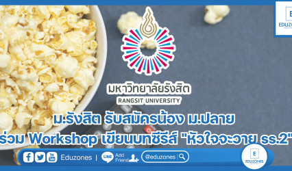 นักเรียน ม.รังสิต รับสมัครน้อง ม.ปลาย ร่วม Workshop เขียนบทซีรีส์ “หัวใจจะวาย ss.2” EZ Webmaster February 6, 2024 สาขาวิชาการเขียนบทและการกำกับภาพยนตร์และโทรทัศน์ วิทยาลัยนิเทศศาสตร์ มหาวิทยาลัยรังสิต เปิดรับสมัครน้องนักเรียนมัธยมศึกษาตอนปลาย ร่วมกิจกรรม Workshop เขียนบทซีรีส์ “หัวใจจะวาย ss.2” นอกจากนี้ ภายในงานมีการเสวนา หัวข้อ “ซีรีส์วาย” จากปลายปากกา สู่หน้าจอ วิทยากรโดย คุณสายพิรุณ ไชยเชียงพิณ เจ้าของผลงานเขียนบทซีรีส์วายชื่อดัง อาทิ My Bromance พี่ชายเดอะซีรีส์ The Reminders เพราะคิดถึง และ Love…