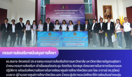 Blogกิจกรรม กรรมการส่งเสริมฯสวนสุนันทา เยี่ยมชมศูนย์การศึกษาระนองพร้อมมอบครุภัณฑ์สนับสนุนการศึกษา tui sakrapee January 30, 2024 ดร.สมชาย อัศวเศรณี ประธานคณะกรรมการส่งเสริมกิจการมหาวิทยาลัย มหาวิทยาลัยราชภัฏสวนสุนันทา ได้นำคณะกรรมการส่งเสริมฯ เข้าเยี่ยมชมห้องประชุม ห้องเรียน ห้องสมุด ห้องนวดภายในอาคารเรียนรวมและปฏิบัติการ พร้อมรับฟังความต้องการในการพัฒนาศูนย์การศึกษาจังหวัดระนอง ณ ห้องประชุม A306 ศูนย์การศึกษาจังหวัดระนอง โดย อาจารย์…