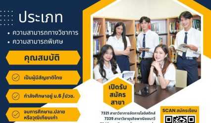 นักเรียน 7สาขาสุดปัง “โลจิสติกส์ สวนสุนันทา” รับรอบโควตา เด่นวิชาการ เชี่ยวชาญความสามารถพิเศษ สมัครได้วันนี้ tui sakrapee January 26, 2024 โลจิสติกส์ สวนสุนันทา เปิดรอบโควตา ประจำปีการศึกษา 2567 • ประเภท • 1. ความสามารถทางวิชาการ 2. ความสามารถพิเศษ คุณสมบัติ เป็นผู้มีสัญชาติไทย กำลังศึกษาอยู่…