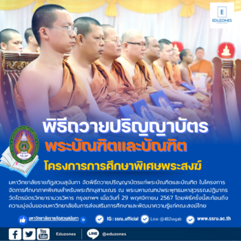 พิธีถวายปริญญาบัตรแก่พระบัณฑิตและบัณฑิต โครงการการศึกษาพิเศษพระสงฆ์ ณ วัดไตรมิตร tui sakrapee November 29, 2024 มหาวิทยาลัยราชภัฏสวนสุนันทา จัดพิธีถวายปริญญาบัตรแก่พระบัณฑิตและบัณฑิต ในโครงการจัดการศึกษาภาคพิเศษสำหรับพระภิกษุสามเณร ณ พระมหามณฑปพระพุทธมหาสุวรรณปฏิมากร วัดไตรมิตรวิทยารามวรวิหาร กรุงเทพฯ เมื่อวันที่ 29 พฤศจิกายน 2567 โดยพิธีครั้งนี้สะท้อนถึงความมุ่งมั่นของมหาวิทยาลัยในการส่งเสริมการศึกษาและพัฒนาความรู้แก่คณะสงฆ์ไทย งานเริ่มต้นด้วย รศ.ดร.ฤๅเดช เกิดวิชัย นายกสภามหาวิทยาลัย เป็นประธานฝ่ายฆราวาส นำพานกรวยดอกไม้สดถวายแด่ สมเด็จพระพุฒาจารย์ พร้อมกราบบังคมทูลถวายรายงานถึงความสำเร็จของโครงการนี้ รศ.ดร.ชุติกาญจน์ ศรีวิบูลย์ อธิการบดีมหาวิทยาลัย ได้กล่าวเชิดชูพระบัณฑิตผู้มีความเพียรเป็นเลิศ โดยเฉพาะพระบัณฑิตเกียรตินิยมอันดับ 1 จากคณะวิทยาศาสตร์และเทคโนโลยี พร้อมรายงานการศึกษาอย่างภาคภูมิ รวมทั้งสิ้น 79 รูป สำหรับพระบัณฑิต และ 15 คน สำหรับบัณฑิตฆราวาส พิธีการดำเนินไปด้วยความสง่างามและสมเกียรติ โดยมีผู้เข้าร่วมงานทั้งคณะสงฆ์ ผู้บริหารมหาวิทยาลัย และญาติโยมที่มาร่วมแสดงความยินดี โครงการการศึกษาภาคพิเศษสำหรับพระภิกษุสามเณร เป็นอีกหนึ่งภารกิจสำคัญที่สะท้อนถึงความตั้งใจของมหาวิทยาลัยราชภัฏสวนสุนันทาในการสนับสนุนพระสงฆ์ให้ได้รับโอกาสทางการศึกษา… Continue Reading