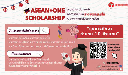 นักศึกษาทุนดีดี มูลนิธิอายิโนะโมะโต๊ะ เปิดรับสมัครทุนศึกษาวิจัย และปริญญาโท โครงการ “ASEAN+ONE SCHOLARSHIP” ประจำปี พ.ศ. 2568 EZ Webmaster December 20, 2023 มูลนิธิอายิโนะโมะโต๊ะ เปิดรับสมัครทุนศึกษาวิจัย และปริญญาโท โครงการ “ASEAN+ONE SCHOLARSHIP” ประจำปีการศึกษา 2568 ในสาขา โภชนาการ วิทยาศาสตร์และเทคโนโลยีทางอาหาร เทคโนโลยีชีวภาพ วิศวกรรมกระบวนการทางชีวภาพ และสิ่งแวดล้อมหรือสาขาที่เกี่ยวข้อง ณ มหาวิทยาลัยชั้นนำ…