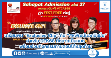 เตรียมพบ “Exclusive Clip” กับ “สหพัฒน์แอดมิชชั่น” สำหรับ DEK68 ที่อยากเป็นหมอ พร้อมร่วมกิจกรรมถามตอบโค้งสุดท้าย EZ Webmaster October 31, 2024 หลังจบกิจกรรมติวระดับภูมิภาคและติวสด 6 วันติดไปเรียบร้อยแล้ว “สหพัฒน์แอดมิชชั่น” ครั้งที่ 27 เดินหน้าพา DEK68 ทั่วประเทศที่อยากเรียนหมอ กับ “Exclusive Clip” คลิปติวสุดเข้ม เสริมวิชาสำคัญ เพื่อเตรียมสอบ ชีววิทยาและความถนัดแพทย์ เต็มอิ่มกับตะลุยโจทย์ชีววิทยา และ TPAT1 ความถนัดแพทย์ ด้วยเนื้อหาที่อัดแน่น 4 ชั่วโมงเต็ม โดยติวเตอร์ชีววิทยา ระดับประเทศ พี่วิเวียน OnDemand (อ.นพ.วีรวัช เอนกจำนงค์พร) พี่แท็ป ALevel by OnDemand (อ.ภาคภูมิ อร่ามอารีกุล) และพี่แมน OnDemand (อ.ชัยรัตน์ กันบุญมา) ซึ่งจะเปิดให้รับชมผ่านทาง www.sahapatadmission.com ตั้งแต่วันที่ 1 พฤศจิกายน 2567 นี้ นอกจากนี้ ในวันที่ 9 พฤศจิกายน ระหว่างเวลา 10.00 น. – 12.00 น. ยังจัดให้มีกิจกรรม Q&A ถาม-ตอบ โค้งสุดท้ายก่อนลงสนามสอบจริง โดยวิทยากรแนะแนวระบบ TCAS และพี่ๆ ติวเตอร์ขั้นเทพ จะมาตอบคำถามไขข้อข้องใจทุกปัญหา TCAS68 ในช่วงโค้งสุดท้ายก่อนสอบเข้ามหาวิทยาลัย ให้กับน้องๆ DEK68 ทุกคน รับชมสดทางเฟซบุ๊ก Sahapat Admission สำหรับน้องๆ DEK68 ที่เข้าติวสด 6 วันติดทั้งแบบออนไซต์และออนไลน์ อย่าลืมมาโหลด Certificate Online… Continue Reading