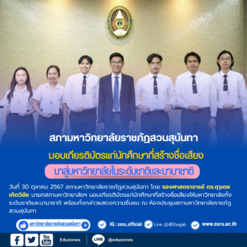สภามหาวิทยาลัยราชภัฏสวนสุนันทา มอบเกียรติบัตรแก่นักศึกษาที่สร้างชื่อเสียงให้มหาวิทยาลัยทั้งระดับชาติและนานาชาติ tui sakrapee October 30, 2024 วันที่ 30 ตุลาคม 2567 สภามหาวิทยาลัยราชภัฏสวนสุนันทา โดย รองศาสตราจารย์ ดร.ฤๅเดช เกิดวิชัย นายกสภามหาวิทยาลัยฯ มอบเกียรติบัตรแก่นักศึกษาที่สร้างชื่อเสียงให้มหาวิทยาลัยทั้งระดับชาติและนานาชาติ พร้อมทั้งกล่าวแสดงความชื่นชม ณ ห้องประชุมสภามหาวิทยาลัย ชั้น 5 อาคาร 31 รายชื่อผู้เข้ารับเกียรติบัตร #รางวัลชนะเลิศ การประชันกลอนสด “”วรรณกวีศรีละโว้” งานแผ่นดินสมเด็จพระนารายณ์มหาราช ครั้งที่ 36 ประจำปี 2567 จัดโดยชมรมวรรณกวีศรีละโว้ ร่วมกับจังหวัดลพบุรี ชมรมอนุรักษ์โบราณวัตถุสถานและสิ่งแวดล้อมจังหวัดลพบุรี สาขาวิชาภาษาไทย คณะมนุษยศาสตร์และสังคมศาสตร์ มหาวิทยาลัยราชภัฏเทพสตรี ได้แก่ 1. นายณัฏฐกร ศรีพระจันทร์ นักศึกษาชั้นปีที่ 3 คณะครุศาสตร์ 2.นางสาวเพ็ชราการ แก้วพิทักษ์… Continue Reading