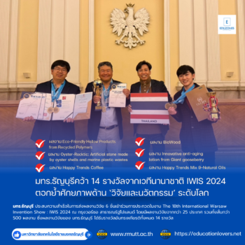มทร.ธัญบุรีคว้า 14 รางวัลจากเวทีนานาชาติ IWIS 2024 ตอกย้ำศักยภาพด้าน ‘วิจัยและนวัตกรรม’ ระดับโลก tui sakrapee October 18, 2024 มทร.ธัญบุรี ประสบความสำเร็จในการส่งผลงานวิจัย 6 ชิ้นเข้าร่วมการประกวดในงาน The 18th International Warsaw Invention Show : IWIS 2024 ณ กรุงวอร์ซอ สาธารณรัฐโปแลนด์ โดยมีผลงานวิจัยจากกว่า 25 ประเทศ รวมทั้งสิ้นกว่า 500 ผลงาน ซึ่งผลงานวิจัยของ มทร.ธัญบุรี ได้รับรางวัลอันทรงเกียรติทั้งหมด 14 รางวัล ประกอบด้วย Grand Prize 1 รางวัล Special Prize On Stage 2 รางวัล Gold Medal 6 รางวัล… Continue Reading