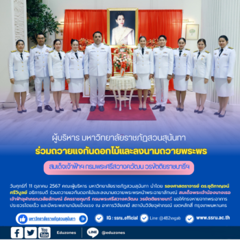 tui sakrapee October 11, 2024 ผู้บริหาร มรภ.สวนสุนันทา ร่วมถวายแจกันดอกไม้และลงนามถวายพระพร สมเด็จเจ้าฟ้าฯ กรมพระศรีสวางควัฒน วรขัตติยราชนารีฯ tui sakrapee October 11, 2024 ผู้บริหาร มรภ.สวนสุนันทา ร่วมถวายแจกันดอกไม้และลงนามถวายพระพร สมเด็จเจ้าฟ้าฯ กรมพระศรีสวางควัฒน วรขัตติยราชนารีฯ วันศุกร์ที่ 11 ตุลาคม 2567 คณะผู้บริหาร มหาวิทยาลัยราชภัฏสวนสุนันทา นำโดย รองศาสตราจารย์ ดร.ชุติกาญจน์ ศรีวิบูลย์ อธิการบดี ร่วมถวายแจกันดอกไม้และลงนามถวายพระพรหน้าพระฉายาลักษณ์ สมเด็จพระเจ้าน้องนางเธอ เจ้าฟ้าจุฬาภรณวลัยลักษณ์ อัครราชกุมารี กรมพระศรีสวางควัฒน วรขัตติยราชนารี ขอให้ทรงหายจากพระอาการประชวรโดยเร็ว และมีพระพลานามัยแข็งแรง ณ อาคารวิจัยเคมี สถาบันวิจัยจุฬาภรณ์ เขตหลักสี่ กรุงเทพมหานคร Continue Reading