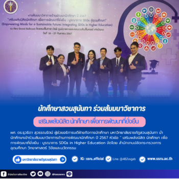 นักศึกษาสวนสุนันทา ร่วมสัมมนาวิชาการ “เสริมพลังนิสิต นักศึกษา เพื่อการพัฒนาที่ยั่งยืน” tui sakrapee September 28, 2024 วันที่ 26 – 27 กันยายน 2567 ณ ห้อง Grand ballroom เซ็นทารา ไลฟ์ ศูนย์ราชการ และคอนเวนชันเซ็นเตอร์ ถ.แจ้งวัฒนะ กรุงเทพมหานคร มหาวิทยาลัยราชภัฏสวนสุนันทา โดย กองพัฒนานักศึกษา ฝ่ายกิจกรรมนักศึกษาและกิจการศิษย์เก่า นำโดย ผู้ช่วยศาสตราจารย์ ดร.ธุวธิดา สุวรรณรัตน์ ผู้ช่วยอธิการบดีฝ่ายกิจการนักศึกษา ได้รับมอบหมายจาก รองศาสตราจารย์ ดร.ชุติกาญจน์ ศรีวิบูลย์ อธิการบดี พร้อมด้วย นายอรรถสิทธิ์ นิกรวัฒน์ หัวหน้าฝ่ายกิจกรรมนักศึกษาและกิจการศิษย์เก่า นายปัณณวัฒน์ ทองสุข และผู้นำนักศึกษา จำนวน 4 คน ได้แก่… Continue Reading