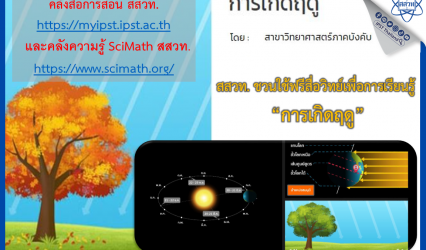 นักเรียน สสวท. ชวนใช้ฟรีสื่อวิทย์เพื่อการเรียนรู้ “การเกิดฤดู” EZ Webmaster October 26, 2023 ปลายฝนต้นหนาวปีนี้แว่วข่าวพยากรณ์อากาศว่าบ้านเราจะเข้าสู่ฤดูหนาวช้ากว่าปกติ และจะหนาวเย็นน้อยกว่าปีที่ผ่านมาด้วย สถาบันส่งเสริมการสอนวิทยาศาสตร์และเทคโนโลยี (สสวท.) ชวนคุณครูอธิบาย “การเกิดฤดู” สร้างความเข้าใจให้ชั้นเรียนแบบไม่ยุ่งยาก ด้วยสื่อ อินเตอร์แอ็กทีฟซิมูเลชัน ตอน การเกิดฤดู สื่อประกอบการจัดการเรียนการสอนวิชาวิทยาศาสตร์ มัธยมศึกษาตอนต้น ที่แสดงรังสีของแสงจากดวงอาทิตย์ที่ตกลงบนโลก ขณะโลกโคจรรอบดวงอาทิตย์ในลักษณะที่แกนโลกเอียงคงที่ ซึ่งส่งผลต่อการเปลี่ยนแปลงอุณหภูมิบนผิวโลกและส่งผลให้เกิดเป็น “ฤดู” ของโลกนั่นเอง ใช้ประกอบการสอนหรือเสริมความเข้าใจบทเรียนได้ คลิกเลยใช้ฟรีที่ คลังความรู้ SciMath สสวท. https://www.scimath.org/desktop-application/item/10591 หรือที่…