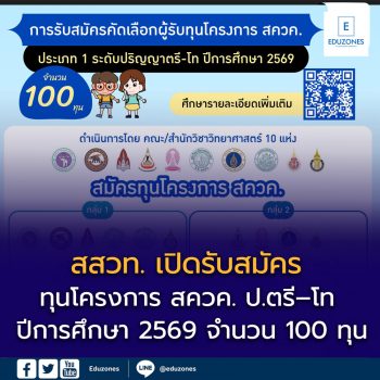 EZ Webmaster November 3, 2025 สสวท. เปิดรับสมัคร ทุนโครงการ สควค. ระดับปริญญาตรี–โท ปีการศึกษา 2569 จำนวน 100 ทุน EZ Webmaster November 3, 2025 📣 โอกาสดีสำหรับ “ว่าที่ครู SMT แห่งอนาคต”! สถาบันส่งเสริมการสอนวิทยาศาสตร์และเทคโนโลยี (สสวท.)เปิดรับสมัครนักเรียนชั้น มัธยมศึกษาปีที่ 6 ปีการศึกษา 2568เข้าร่วมคัดเลือก ทุนโครงการ สควค. (ทุนครู SMT)ประเภทที่ 1 ระดับ ปริญญาตรี–โท ปีการศึกษา 2569จำนวนรวม 100 ทุน 🎓 ทุนนี้มุ่งพัฒนา “ครู SMT” (Science, Math, Technology) รุ่นใหม่ให้มีความรู้ ความสามารถ และคุณภาพตามมาตรฐานสากล… Continue Reading