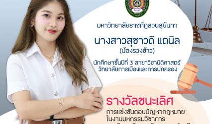Blogนักศึกษา “น้องรวงข้าว” นักศึกษานิติศาสตร์ สวนสุนันทา ชนะเลิศแข่งตอบปัญหากฎหมาย tui sakrapee October 12, 2023 มหาวิทยาลัยราชภัฏสวนสุนันทา ขอแสดงความยินดีกับ “นางสาวสุชาวดี แตนิล” น้องรวงข้าว นักศึกษาชั้นปีที่ 3 สาขาวิชานิติศาสตร์ วิทยาลัยการเมืองและการปกครอง ที่ได้คว้ารางวัลชนะเลิศ การแข่งขันตอบปัญหากฎหมาย ในงานมหกรรมวิชาการ มหาวิทยาลัยราชภัฏสุราษฎร์ธานี ครบรอบ 50 ปี…
