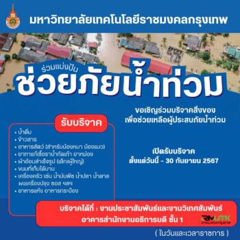 มหาวิทยาลัยเทคโนโลยีราชมงคลกรุงเทพ ขอเชิญร่วมบริจาคสิ่งของ ช่วยเหลือผู้ประสบภัยน้ำท่วม tui sakrapee September 15, 2024 มหาวิทยาลัยเทคโนโลยีราชมงคลกรุงเทพ ขอเชิญร่วมบริจาคสิ่งของ ช่วยเหลือผู้ประสบภัยน้ำท่วม เปิดรับบริจาค • น้ำดื่ม • ข้าวสาร • อาหารสัตว์ (สําหรับน้องหมา น้องแมว) • ยาทาแก้เชื้อราน้ำกัดเท้า ยาหม่อง • ผ้าอ้อมสําเร็จรูป (เด็ก/ผู้ใหญ่) • ขนมที่เก็บได้นาน • เครื่องครัว เช่น น้ำมันพืช น้ำปลา น้ำตาล ผงเครื่องปรุง ซอส ฯลฯ • อาหารแห้ง อาหารกระป๋อง เปิดรับบริจาค ตั้งแต่วันนี้ – 30 กันยายน 2567 บริจาคได้ที่ : งานประชาสัมพันธ์และงานวิเทศสัมพันธ์ อาคารสํานักงานอธิการบดี… Continue Reading