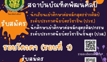 นักเรียน วิทยาลัยช่างศิลป เปิดรับสมัครนักเรียนเข้าศึกษา ระดับปวช. และปวส. ปีการศึกษา 2567 EZ Webmaster October 5, 2023 วิทยาลัยช่างศิลป สถาบันบัณฑิตพัฒนศิลป์รับสมัครนักเรียนเข้าศึกษาต่อหลักสูตรช่างศิลป์ ระดับประกาศนียบัตรวิชาชีพ (ปวช.) และรับสมัครนักศึกษาเข้าศึกษาต่อหลักสูตรศิลปกรรมระดับประกาศนียบัตรวิชาชีพชั้นสูง (ปวส.) ปีการศึกษา 2567 รอบโควตา (รอบที่ 1) โดยเปิดรับสมัครระหว่างวันที่ 1-19 พฤศจิกายน พ.ศ. 2566…
