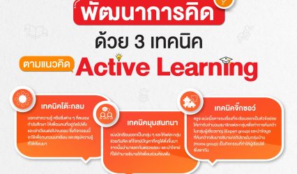 นักเรียนครู-อาจารย์ 3 เทคนิคพัฒนาการคิด ด้วยการเรียนรู้แบบ Active Learning EZ Webmaster September 25, 2023 การเรียนรู้แบบ Active Learning เป็นหลักการสอนที่เน้นให้นักเรียนมีส่วนร่วมกับการเรียนมากที่สุด ซึ่งคุณครูสามารถสร้างกิจกรรมในห้องเรียนได้หลากหลาย โดยมีตัวอย่างเทคนิคต่าง ๆ ดังนี้ . เทคนิคโต๊ะกลม บอกเล่าความรู้ หรือสิ่งต่าง ๆ ที่ตนเองกำลังศึกษา ให้เพื่อนคนที่อยู่ถัดไปฟัง และเล่าเวียนต่อไปจนครบ…