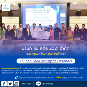 ซัน สตีล 2021 มอบทุนการศึกษาแก่นักศึกษาคณะบริหารธุรกิจ มทร.ธัญบุรี tui sakrapee August 28, 2024 รศ.ดร.สมหมาย ผิวสอาด รักษาการในตำแหน่งอธิการบดีมหาวิทยาลัยเทคโนโลยีราชมงคลธัญบุรี พร้อมผู้บริหารร่วมเป็นสักขีพยานการมอบทุนการศึกษาแก่ นายรชต บุญเยี่ยม นักศึกษาคณะบริหารธุรกิจ โดย คุณเต็มฟ้า ไชยศิริ รองกรรมการผู้จัดการ บริษัท ซัน สตีล 2021 จำกัด วันที่ 26 สิงหาคม 2567 ณ ห้องประชุมมังคลอุบล มทร.ธัญบุรี Continue Reading