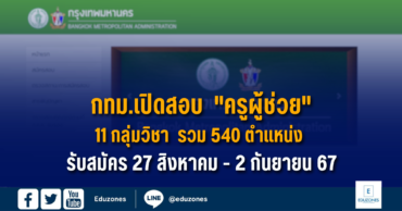 EZ Webmaster August 22, 2024 กทม.เปิดสอบ “ครูผู้ช่วย” 11 กลุ่มวิชา รวม 540 ตำแหน่ง รับสมัคร 27 ส.ค.-2 ก.ย.นี้ EZ Webmaster August 22, 2024 สำนักงานคณะกรรมการข้าราชการกรุงเทพมหานคร ประกาศรับสมัครสอบแข่งขันเพื่อบรรจุและแต่งตั้งบุคคลเข้ารับราชการเป็นข้าราชการครู และบุคลากรทางการศึกษากรุงเทพมหานคร ตำแหน่งครูผู้ช่วย ครั้งที่ 1/2567 วันรับสมัคร 27 สิงหาคม – 2 กันยายน 2567 คลิกเข้าสู่ระบบรับสมัครสอบออนไลน์ . ตำแหน่งที่เปิดรับสมัคร ตำแหน่งครูผู้ช่วย สำหรับผู้มีวุฒิปริญญาตรี หลักสูตร 4 ปี ตำแหน่งครูผู้ช่วย สำหรับผู้มีวุฒิระดับปริญญาตรี หลักสูตร 5 ปี ตำแหน่งครูผู้ช่วย สำหรับผู้มีวุฒิปริญญาตรี หลักสูตร 4 ปี และประกาศนียบัตรบัณฑิตที่มีหลักสูตรการศึกษา… Continue Reading