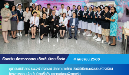 Blogกิจกรรม กุมารเวชศาสตร์ รพ.จุฬาลงกรณ์ สภากาชาดไทย จัดพิธีเปิดและรับมอบห้องเรียนโครงการสอนเด็กเจ็บป่วยเรื้อรัง และศูนย์คอมพิวเตอร์ฯ จาก บริษัท วอลท์ดีสนี่ southeast asia tui sakrapee September 15, 2023 ฝ่ายกุมารเวชศาสตร์ โรงพยาบาลจุฬาลงกรณ์ สภากาชาดไทย จัดพิธีเปิดและรับมอบห้องเรียนโครงการสอนเด็กเจ็บป่วยเรื้อรัง และศูนย์คอมพิวเตอร์เพื่อเด็กป่วย จาก บริษัท วอลท์ดีสนี่ southeast asia ซึ่งเล็งเห็นถึงความสำคัญของการพัฒนาการเรียนรู้ และการศึกษา จึงสนับสนุนปรับปรุงสภาพแวดล้อมห้องเรียนของโครงการสอนเด็กเจ็บป่วยเรื้อรัง และศูนย์คอมพิวเตอร์เพื่อเด็กป่วย โดยมี รศ.นพ.รัฐพลี…