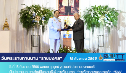 Blogกิจกรรม มทร.ธัญบุรี จัดพิธีน้อมรำลึก-มอบรางวัลราชมงคลสรรเสริญ วันพระราชทานนาม “ราชมงคล” tui sakrapee September 15, 2023 เมื่อวันที่ 15 กันยายน 2566 พลเอก สุรยุทธ์ จุลานนท์ ประธานองคมนตรี เป็นประธานมอบรางวัลผู้มีผลงานดีเด่นทางวัฒนธรรม “รางวัลราชมงคลสรรเสริญ 2566” เนื่องในโอกาสวันคล้ายวันพระราชทานนาม “ราชมงคล” ณ หอประชุมมหาวิทยาลัยเทคโนโลยีราชมงคลธัญบุรี รองศาสตราจารย์…