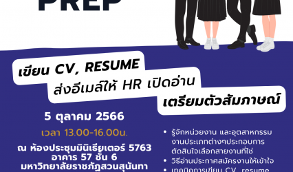 Blogนักศึกษา สวนสุนันทา เตรียมนักศึกษา พร้อมก้าวสู่โลกการทำงาน tui sakrapee September 9, 2023 กองพัฒนานักศึกษา มหาวิทยาลัยราชภัฏสวนสุนันทา และบริษัท เอฟเอ็น เอดูคอน จำกัด จัดกิจกรรมอบรมเพื่อเตรียมความพร้อมนักศึกษาในการสมัครงาน การเขียน CV หรือ Resume ยังไงดี / เตรียมตัวสัมภาษณ์ยังไงให้ได้งาน วันพฤหัสบดีที่ 5…