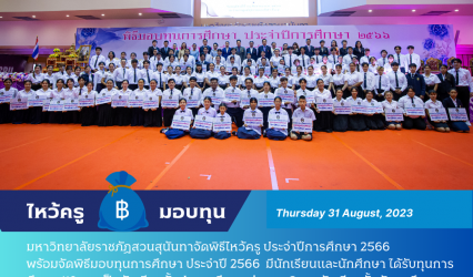 Blogนักศึกษา ไหว้ครู พร้อมมอบทุนการศึกษา “สวนสุนันทา” ปีการศึกษา 2566 tui sakrapee September 1, 2023 มหาวิทยาลัยราชภัฏสวนสุนันทาจัดพิธีไหว้ครู ประจำปีการศึกษา 2566 พร้อมจัดพิธีมอบทุนการศึกษา ประจำปี 2566 มีนักเรียนและนักศึกษา ที่ได้รับทุนการศึกษา จำนวนทั้งสิ้น 110 คน เป็นจำนวนเงินทั้งสิ้น 940,000บาท ไหว้ครู ประจำปีการศึกษา 2566…