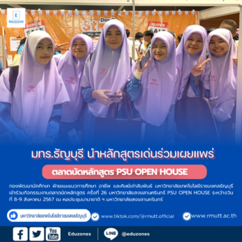 มทร.ธัญบุรี นำหลักสูตรเด่นร่วมเผยแพร่ ในกิจกรรมตลาดนัดหลักสูตร PSU OPEN HOUSE tui sakrapee August 8, 2024 กองพัฒนานักศึกษา ฝ่ายแนะแนวการศึกษา อาชีพ และศิษย์เก่าสัมพันธ์ มหาวิทยาลัยเทคโนโลยีราชมงคลธัญบุรี เข้าร่วมกิจกรรมงานตลาดนัดหลักสูตร ครั้งที่ 26 มหาวิทยาลัยสงขลานครินทร์ PSU OPEN HOUSE ระหว่างวันที่ 8-9 สิงหาคม 2567 ณ หอประชุมนานาชาติ ฯ มหาวิทยาลัยสงขลานครินทร์ โดย ผศ.ดร.เถกิง วงศ์ศิริโชติ รองอธิการบดี ฝ่ายวิชาการและวิเทศสัมพันธ์ ประธานในพิธี และกล่าวต้อนรับนักเรียน นิสิตนักศึกษา ครูผู้ปกครอง หน่วยงานที่สนใจเข้าร่วมชมนิทรรศการตลาดนัดหลักสูตรอุดมศึกษา สำหรับในงานครั้งนี้มีสถาบันการศึกษา 90 กว่าสถาบัน เข้าร่วม 150 บูธนิทรรศการ เพื่อประชาสัมพันธ์เผยแพร่หลักสูตรการเรียนการสอน ระดับอุดมศึกษาทั่วประเทศไทยให้แก่นักเรียนชั้นมัธยมศึกษาตอนปลาย ครูแนะแนว ผู้ปกครอง และนักศึกษาที่สนใจเข้าร่วมชมนมิทรรศการ ณ… Continue Reading