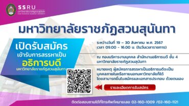 มรภ.สวนสุนันทา เปิดรับการสรรหา “อธิการบดี” tui sakrapee August 6, 2024 มหาวิทยาลัยราชภัฎสวนสุนันทา เปิดการรับสมัครเข้ารับการสรรหาเป็นอธิการบดีมหาวิทยาลัยราชภัฏสวนสุนันทา ระหว่างวันที่ 19 – 30 สิงหาคม พ.ศ. 2567 เวลา 09.00 – 16.00 น. (ในวันเวลาราชการ) โดยผู้สนใจสมัครเข้ารับการสรรหาเป็นอธิการบดีจะเป็นบุคคลภายในหรือภายนอกมหาวิทยาลัยก็ได้ สามารถยืนในสมัครและเอกสารประกอบด้วยตนเอง ได้ที่เลขานุการคณะกรรมการสรรหาฯ ณ กองบริหารงานบุคคล สำนักงานอธิการบดี ชั้น 4 มหาวิทยาลัยราชภัฎสวนสุนันทา ติดต่อสอบถามได้ที่โทรศัพท์หมายเลข 02-160-1009 , 02-160-1121 ทั้งนี้ เพื่อให้กระบวนการสรรหาอธิการบดีมหาวิทยาลัยราชภัฏสวนสุนันทา เป็นไปด้วยความเรียบร้อยตามเจตนารมณ์และวัตถุประสงค์แห่งพระราชบัญญัติมหาวิทยาลัยราชภัฎ พ.ศ. 2547 อาศัยความตามข้อบังคับมหาวิทยาลัยราชภัฏสวนสุนันทา ว่าด้วยคุณสมบัติ หลักเกณฑ์และวิธีการสรรหาอธิการบดี พ.ศ. 2566 ข้อ 6 ข้อ 7… Continue Reading