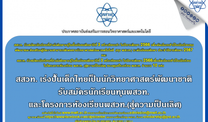 นักเรียน สสวท. เร่งปั้นเด็กไทยเป็นนักวิทยาศาสตร์พัฒนาชาติ รับสมัครนักเรียนทุนพสวท. และโครงการห้องเรียนพสวท. (สู่ความเป็นเลิศ) EZ Webmaster August 7, 2023 สถาบันส่งเสริมการสอนวิทยาศาสตร์และเทคโนโลยี (สสวท.) รับสมัครสอบคัดเลือกนักเรียนที่กำลังศึกษาอยู่ในชั้นมัธยมศึกษาปีที่ 3 หรือเทียบเท่า ปีการศึกษา 2566 เพื่อคัดเลือกเข้ารับทุนพัฒนาและส่งเสริมผู้มีความสามารถพิเศษทางวิทยาศาสตร์และเทคโนโลยี (ทุน พสวท.) ระดับมัธยมศึกษา ประจำปีการศึกษา 2567 และ โครงการห้องเรียน พสวท. (สู่ความเป็นเลิศ) ประจำปีการศึกษา 2567 ซึ่งการคัดเลือกนักเรียนรอบแรกดำเนินการพร้อมกับการคัดเลือกนักเรียนของโรงเรียนมหิดลวิทยานุสรณ์โดยใช้ข้อสอบเดียวกัน เปิดรับสมัครตั้งแต่วันที่ 1 – 31 สิงหาคม 2566 สมัครได้ที่เว็บไซต์ www.mwit.ac.th สอบถามเกี่ยวกับระบบสมัครสอบที่อีเมล admission@mwit.ac.th ทั้งนี้ทุนพัฒนาและส่งเสริมผู้มีความสามารถพิเศษทางวิทยาศาสตร์และเทคโนโลยี (ทุน พสวท.) ระดับมัธยมศึกษา จำนวน 40 ทุน สำหรับโครงการห้องเรียน พสวท. (สู่ความเป็นเลิศ) ประจำปีการศึกษา 2567 จัดสรรให้ศึกษา ณ…