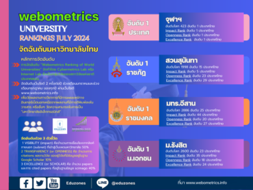 tui sakrapee July 19, 2024 “สวนสุนันทา” ยึดแชมป์ราชภัฏ 20 สมัยต่อเนื่อง “มทร.อีสาน” ที่ 1 ราชมงคล “ม.รังสิต” ที่ 1 ม.เอกชน “จุฬาฯ” ยืน 1 ประเทศ จากอันดับ Webometrics Ranking July 2024 tui sakrapee July 19, 2024 “จุฬาฯ” ยังครองที่ 1 ประเทศ ส่วน “สวนสุนันทา” ยังยืนตำแหน่งแชมป์ราชภัฏยาวนาน 20 สมัย “มทร.อีสาน” ครองที่ 1 ราชมงคล ด้าน ม.รังสิต ยังที่ 1 ม.เอกชนอีกครั้งจากอันดับ Webometrics Ranking Universities: July 2024 ………………………………………………………………………………………… Cybermetrics Lab แห่งสภาวิจัย (CSIC) ประเทศสเปน ได้ประกาศผลการจัดอันดับมหาวิทยาลัยทั่วโลกประจำเดือนกรกฎาคม 2024 แล้ว… Continue Reading