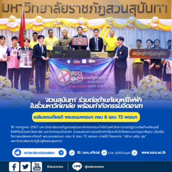‘สวนสุนันทา’ ร่วมต่อต้านภัยบุหรี่ไฟฟ้าในรั้วมหาวิทยาลัย พร้อมทำกิจกรรมจิตอาสา เนื่องในโอกาสเฉลิมพระเกียรติ พระชนมพรรษา ครบ 6 รอบ 72 พรรษา tui sakrapee July 18, 2024 สวนสุนันทาร่วมทำดีด้วยหัวใจชาวราชภัฏร่วมต่อต้านภัยบุหรี่ไฟฟ้าในรั้วมหาวิทยาลัย และกิจกรรมจิตอาสา ร่วมแสดงความจงรักภักดีและสำนึกในพระมหากรุณาธิคุณ เนื่องในโอกาสเฉลิมพระเกียรติ พระชนมพรรษา ครบ 6 รอบ 72 พรรษา 18 กรกฎาคม 2567 มหาวิทยาลัยราชภัฏสวนสุนันทาจัดกิจกรรมทำดีด้วยหัวใจชาวราชภัฏร่วมต่อต้านภัยบุหรี่ไฟฟ้าในรั้วมหาวิทยาลัย และกิจกรรมจิตอาสา ร่วมแสดงความจงรักภักดีและสำนึกในพระมหากรุณาธิคุณ เนื่องในโอกาสเฉลิมพระเกียรติ พระชนมพรรษา ครบ 6 รอบ 72 พรรษา ภายใต้ โครงการ “สร้าง เสริม สุข” มหาวิทยาลัยราชภัฏไปสู่สังคมสุขภาวะ มหาวิทยาลัยราชภัฏสวนสุนันทา ณ อาคารศูนย์สุขภาพและกีฬา ชั้น4 และบริเวณรอบมหาวิทยาลัยราชภัฏสวนสุนันทา (Onsite และ Online พร้อมกัน 38 ราชภัฏ ผ่านระบบ Zoom)… Continue Reading