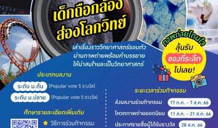 นักเรียน ไม่ใช่ประกวดแต่ชวนนักเรียน ม.1 – ม.6 ร่วมสนุก ถ่ายภาพหัวข้อ “เด็กถือกล้อง ส่องโลกวิทย์” EZ Webmaster July 20, 2023 สถาบันส่งเสริมการสอนวิทยาศาสตร์และเทคโนโลยี (สสวท.) ชวนนักเรียนชั้นมัธยมศึกษาปีที่ 1 – 6 ร่วมสนุกกับกิจกรรมถ่ายภาพวิทยาศาสตร์พร้อมคำบรรยายภาพ ต้อนรับสัปดาห์วันวิทยาศาสตร์แห่งชาติ หัวข้อ “เด็กถือกล้อง ส่องโลกวิทย์” เล่าเรื่องราววิทยาศาสตร์รอบตัวผ่านมุมมองของนักเรียนมัธยมศึกษาด้วยภาพถ่ายพร้อมคำอธิบายที่น่าสนใจ ผลงานใครเข้าตามหาชน (popular vote) ได้รับของที่ระลึกจากเฟซบุ๊ก IPST Thailand ประเภทการส่งผลงานร่วมกิจกรรม ระดับมัธยมศึกษาตอนต้น (ม.1–ม.3) หรือเทียบเท่า และ มัธยมศึกษาตอนปลาย (ม.4–ม.6) หรือเทียบเท่า ส่งได้คนละ 1 ผลงาน ส่งผลงานร่วมสนุกได้ตั้งแต่บัดนี้ถึงวันที่…