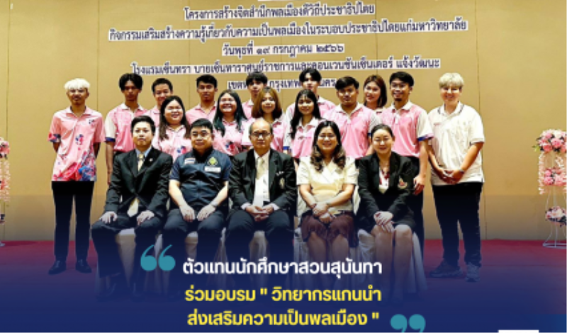 Blogนักศึกษา ตัวแทนนักศึกษาสวนสุนันทา ร่วมอบรม “วิทยากรแกนนำส่งเสริมความเป็นพลเมือง” tui sakrapee July 19, 2023 วันที่ 19 กรกฏาคม 2566 ฝ่ายวินัยและพัฒนานักศึกษา กองพัฒนานักศึกษา โดย นางสาวภุมรินทร์ ส่งสัมพันธ์สกุล นำตัวแทนนักศึกษาเข้าร่วมการอบรม “วิทยากรแกนนำส่งเสริมความเป็นพลเมือง” ภายใต้โครงการสร้างจิตสำนึกพลเมืองดีวิถีประชาธิปไตย เพื่อให้นักศึกษานำความรู้ไปขับเคลื่อนกิจกรรมภายในมหาวิทยาลัย ณ ห้องประชุมวายุภักษ์ 5…