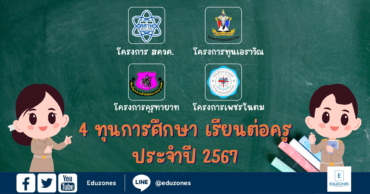 EZ Webmaster June 25, 2024 4 ทุนการศึกษาเรียนต่อครู ประจำปี 2567 ศึกษาก่อน! วางแผนได้ทันเวลา! EZ Webmaster June 25, 2024 แนะนำ 4 ทุนการศึกษาเรียนต่อครู สำหรับนักเรียนชั้นมัธยมศึกษาตอนปลายที่มีความใฝ่ฝันอยากเป็นครูและสนใจอยากเรียนต่อระดับปริญญาตรีในสายอาชีพครู โดยสามารถศึกษารายละเอียดเกี่ยวกับทุนการศึกษา ทั้ง 4 ทุน เพื่อวางแผนการเตรียมตัวได้ทันเวลา! 1.โครงการ สควค. ปริญญาตรีต่อเนื่องโท ทุนโครงการ สควค. เป็นทุน”ส่งเสริมการผลิตครูที่มีความสามารถพิเศษด้านวิทยาศาสตร์และคณิตศาสตร์” ซึ่งสนับสนุนโดย สสวท. ภายใต้การเรียนระดับปริญญาตรีในหลักสูตรวิทยาศาสตรบัณฑิต (วท.บ) ของสถาบัน 10 แห่ง และต่อระดับปริญญาโทเพื่ออนุมัติใบประกอบวิชาชีพครู ระดับทุนการศึกษา : ปริญญาตรีต่อเนื่องปริญญาโท ระยะเวลาศึกษา : รวม 6 ปี (ระดับปริญญาตรี… Continue Reading
